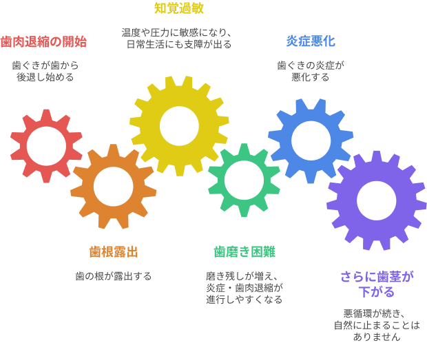 放置しても自然に治ることはなく、徐々に進行していきます。歯ぐきが下がって、知覚過敏の症状が出てくると歯磨きがしづらくなり、十分に汚れが落とせない → 炎症が起きやすくなるという悪い流れが始まります。